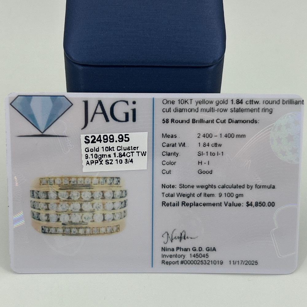 This 10kt gold ring, weighing 9.10gms, is an exquisite cluster of 1.84ct diamonds. Certified by Jagi and appraised at $4850, it's not just jewelry but a statement of elegance. Own it, wear it, and let each diamond speak volumes of your unique style and sophistication. Limitless shine for limited edition individuals.