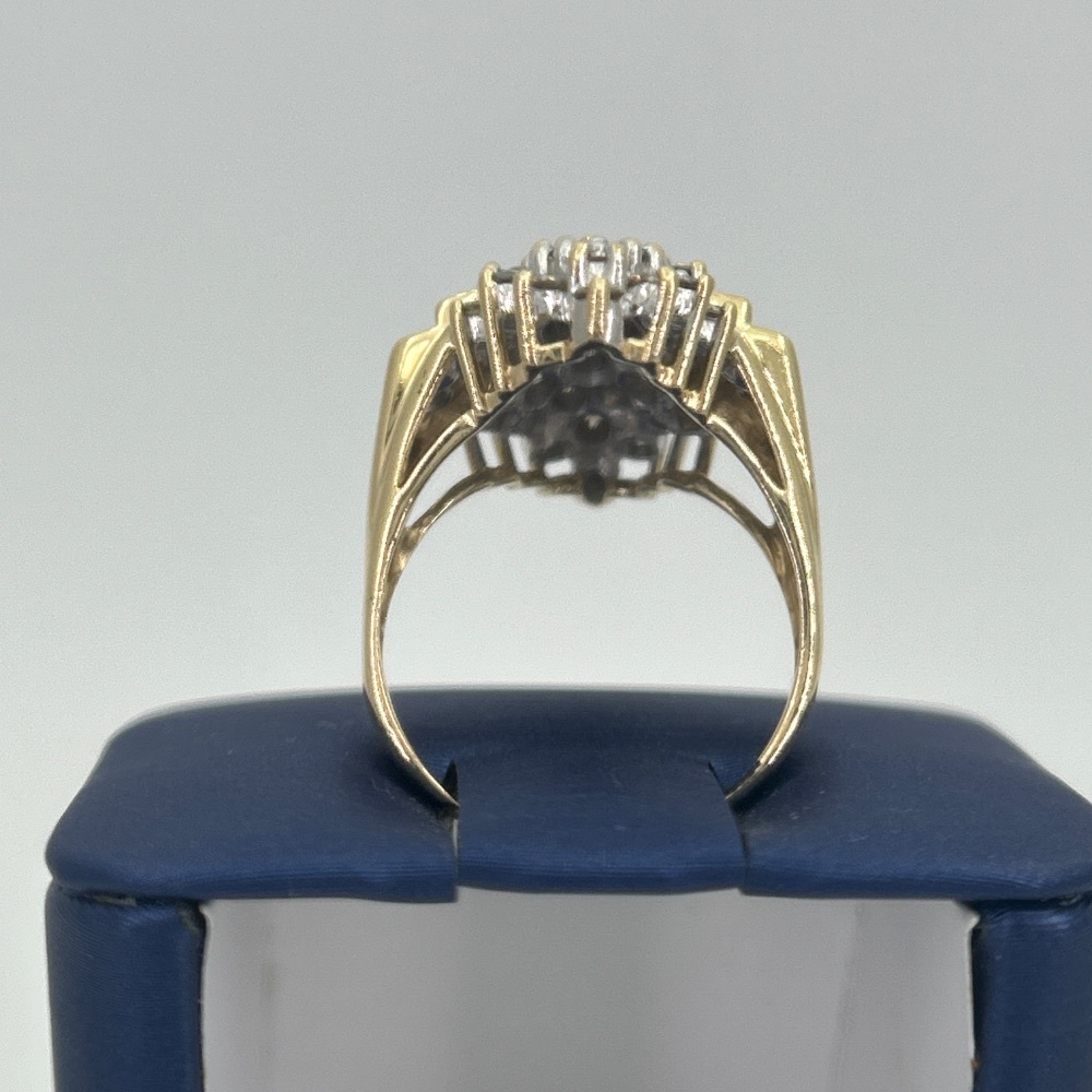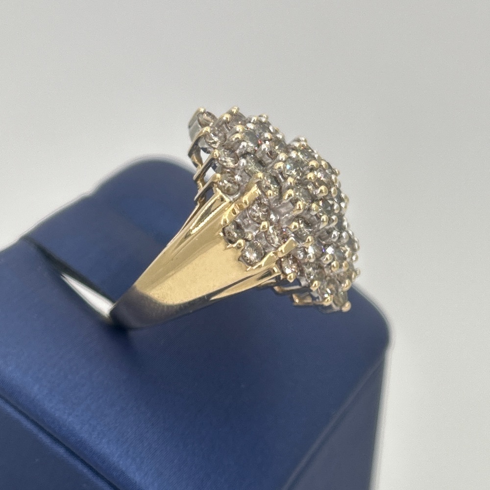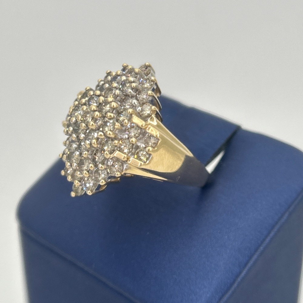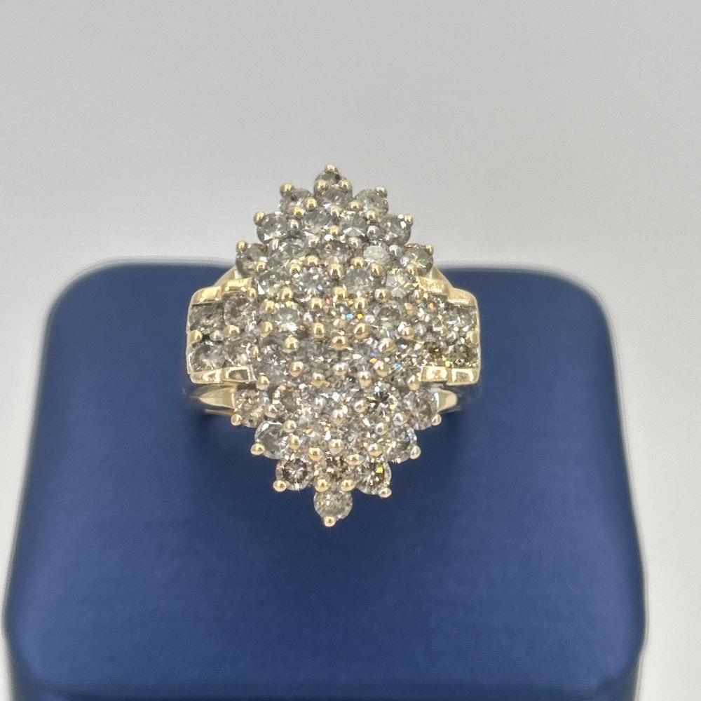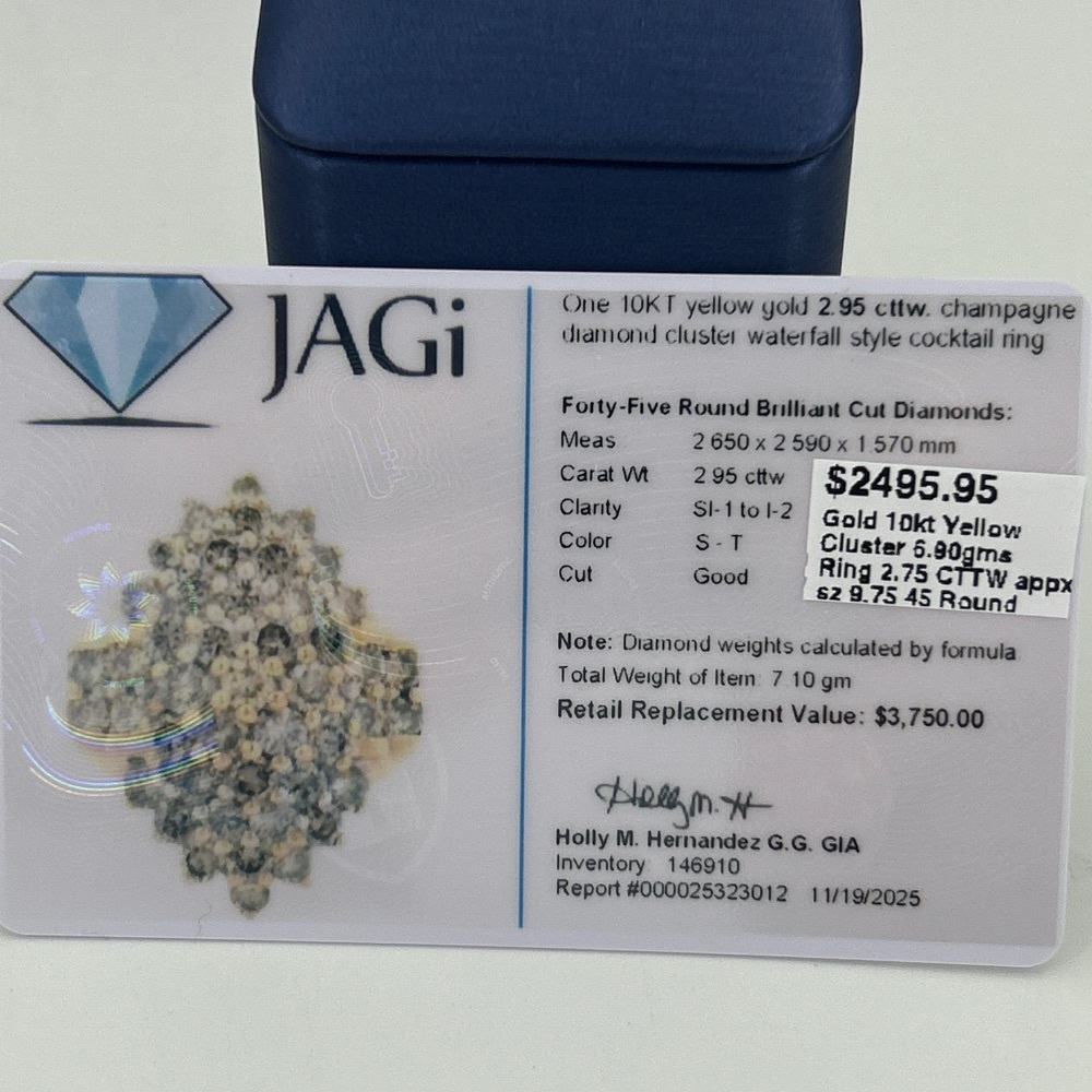 Delve into the dazzling allure of our 10kt Gold Yellow Cluster ring, weighing 6.90gms. Encrusted with 45 glistening round diamonds making up to an approximate CTTW of 2.95, this radiant adornment is a vision of elegance. Flaunt the size 9.75 masterpiece, halcyon yellow circle of abundant sparkle, authenticated by Jagi certificate, boasting an appraised value of $3750; when luxury is refined to its purest form!