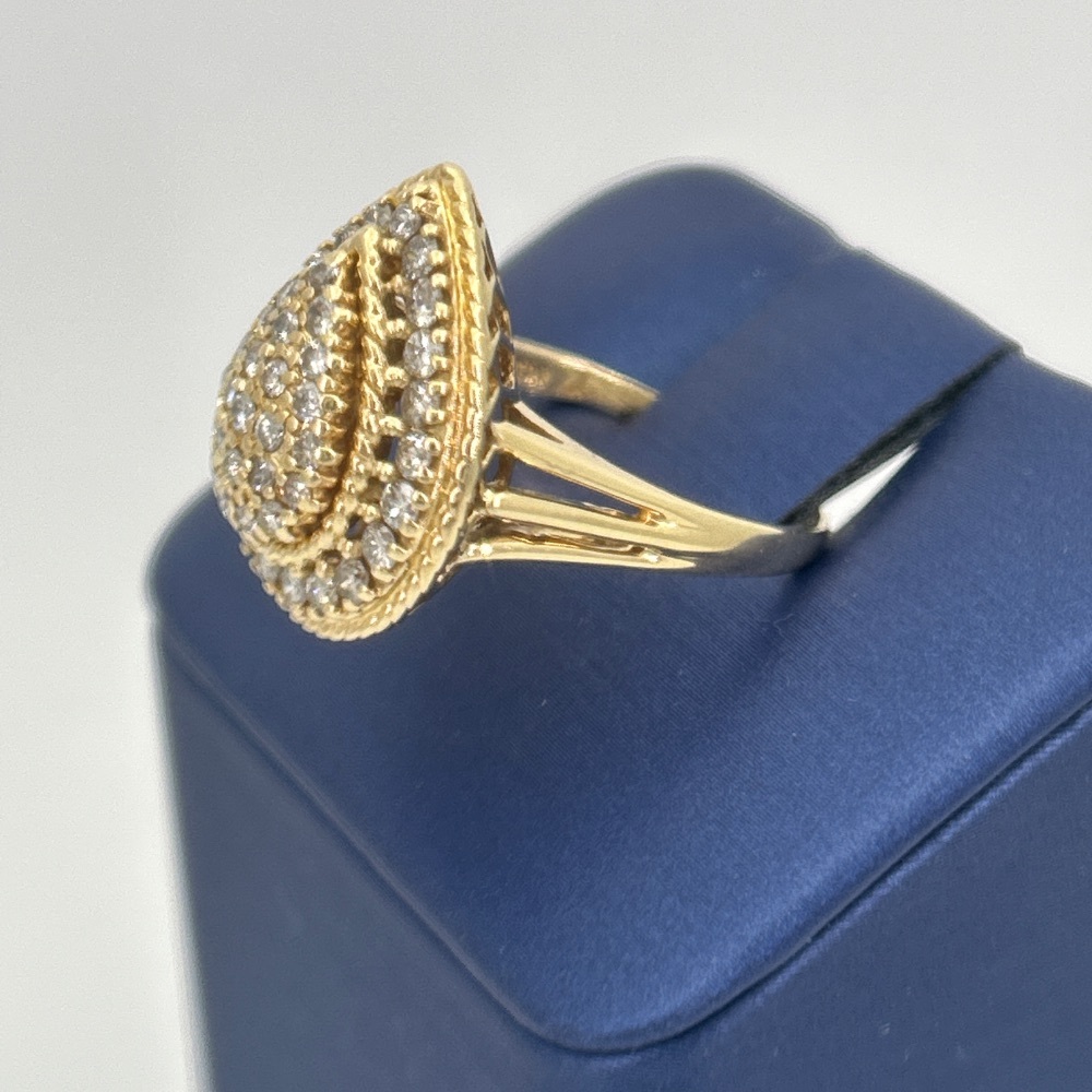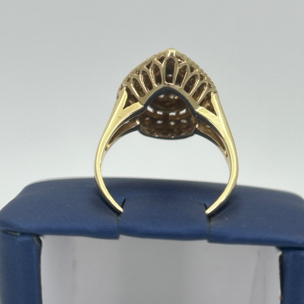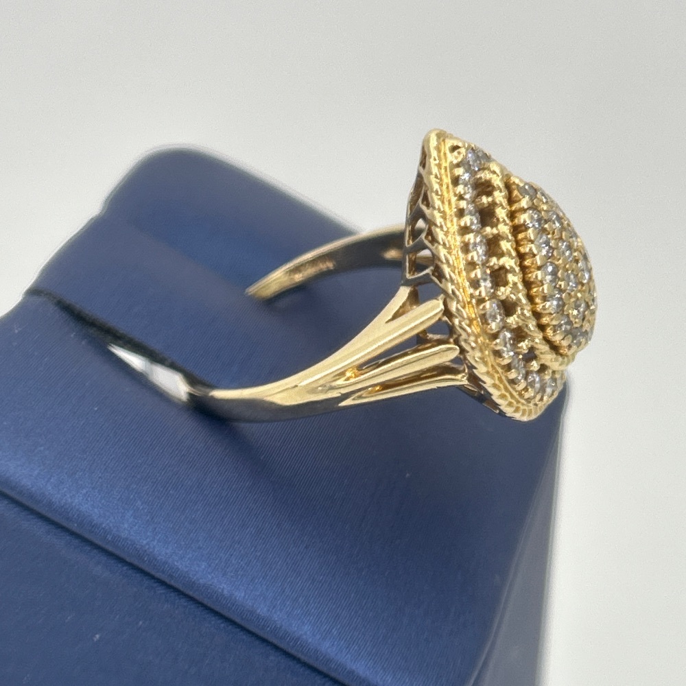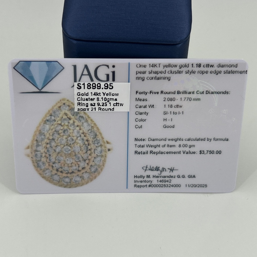 Experience sheer luxury with this stunning 14kt Gold Yellow Cluster Ring. Adorned with a celestial cluster of 21 twinkling round-cut diamonds, totaling 1.18 cttw, this masterpiece weighs 8.10gms. Sized 9.25, it's as perfect a fit as it is an eye-captivating spectacle. Immaculately appraised by JAGI with a cert-worthy value of $3750. Indulge yourself in its radiant allure!