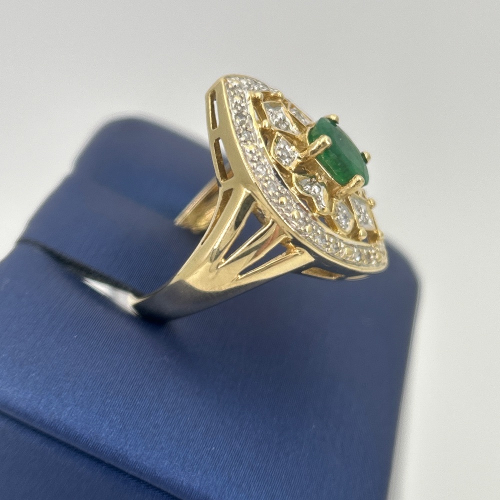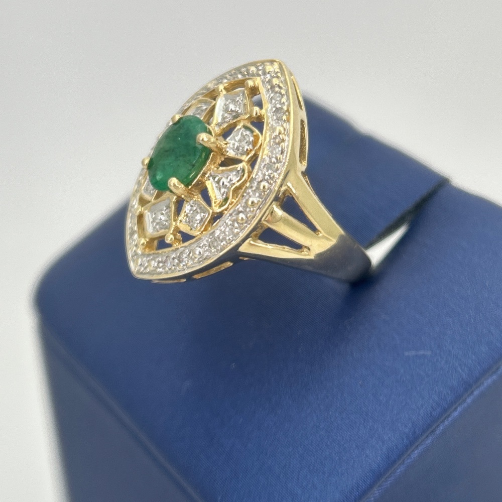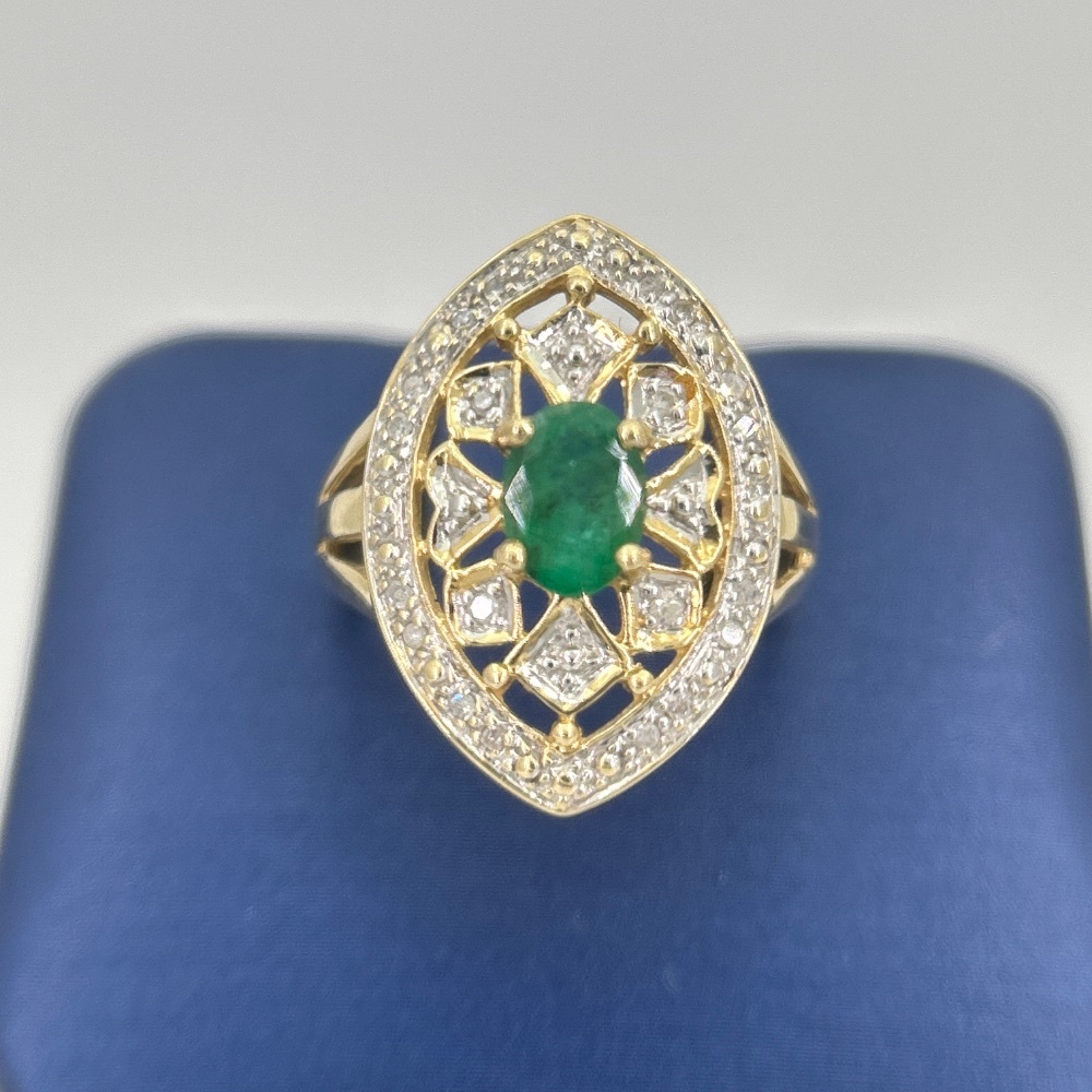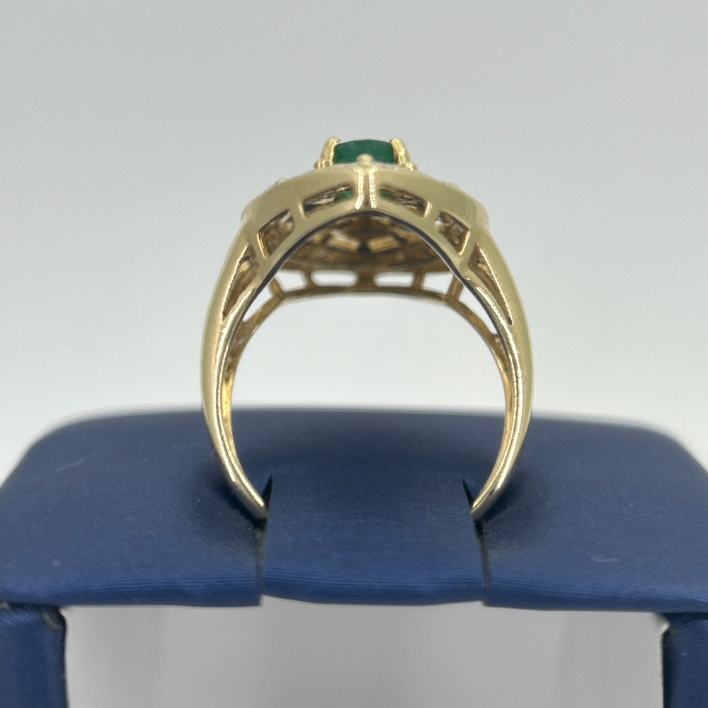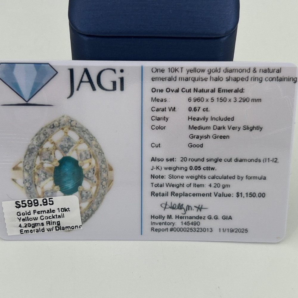 Experience lavish splendor with this 10kt yellow gold cocktail ring, gleaming with emerald and diamond accoutrement. Weighing a substantial 4.20gms, this stylish statement in sophistication glimmers in size 8. Certified and appraised by JAGI, it holds a dazzling value of $1,150. Unleash your inner diva today!