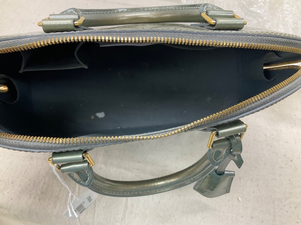 Get swept away by the elegance of the Louis Vuitton Alma Hand Bag. Dipped in a captivating seafoam green vernis finish, this masterpiece perfectly marries style and sophistication. Limited editions are rare, just like you! Splurge and let its charm shine through the crowd.