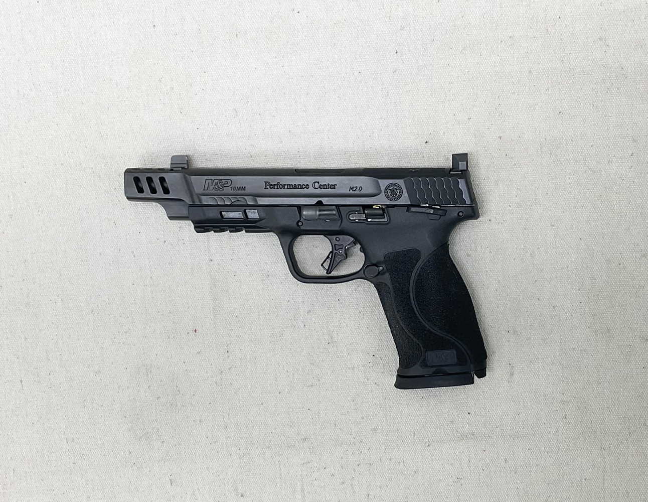 Smith & Wesson Performance Center M2.0, M&P10mm Semi-Auto Pistol, incorporates advanced safety mechanisms and ergonomics. It features a 5 stainless-steel barrel, smooth trigger pull, and fixed sights. Built with an aggressively-textured, reinforced polymer frame for enhanced control, it offers impeccable longevity. Includes two 15-round magazines and four interchangeable palmswell grip sizes.
